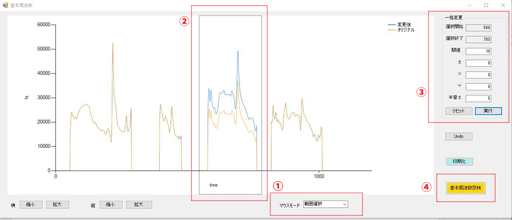 「基本周波数変更」ボタンを押して展開した画面で、エディットすることができます