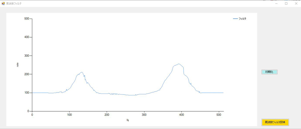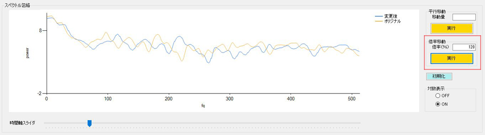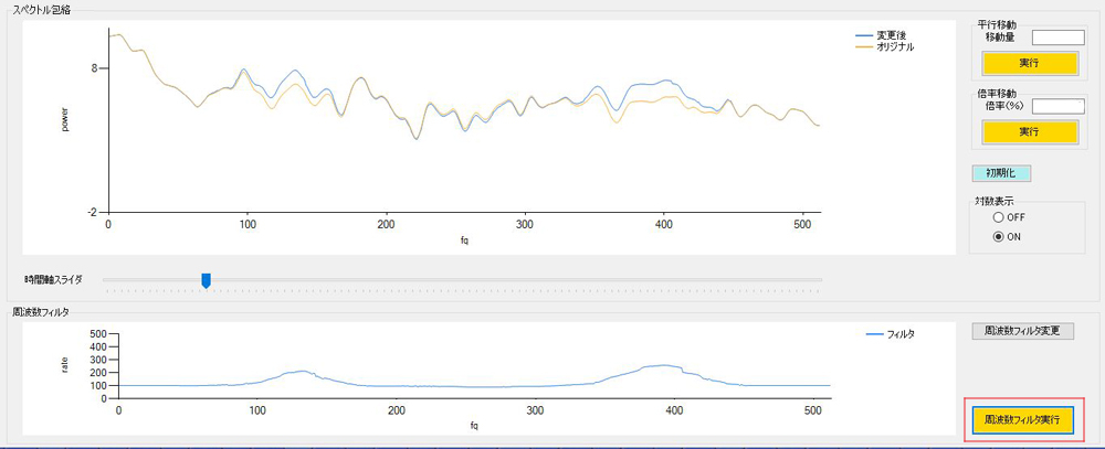 「周波数フィルタ実行」ボタンを押すと、スペクトル包絡にフィルタの倍率(%)が反映されます