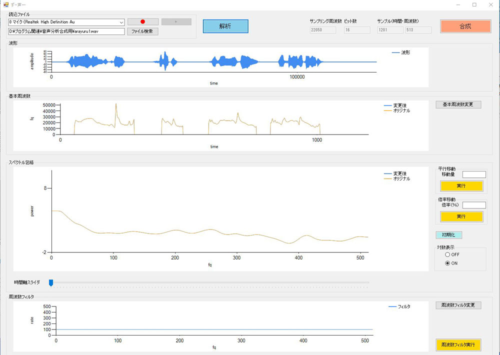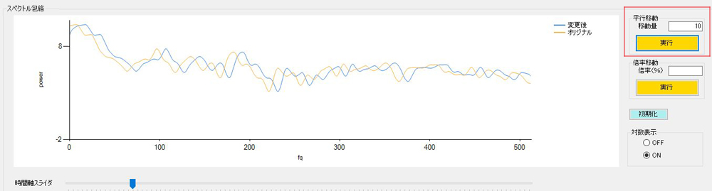 「平行移動」「倍率移動」の実行、周波数フィルタを実行することで、音色を変更することができます