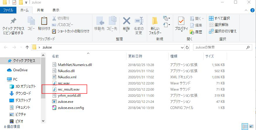 ファイル名は、読込んだファイル名(録音した場合は「rec」) + 「result.wav」となります