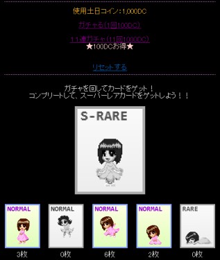 ■土日ガチャ 2012.07.08 【 お題 】 ガチャ 【ジャンル】 コンプガチャ 【 概要 】 コンプガチャです ガチャ画面へ |